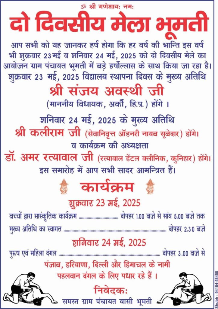 भूमती में दो दिवसीय मेले का आयोजन 23 और 24 मई 2025 को होने जा रहा है, जिसमें आप सभी सादर आमंत्रित हैं।