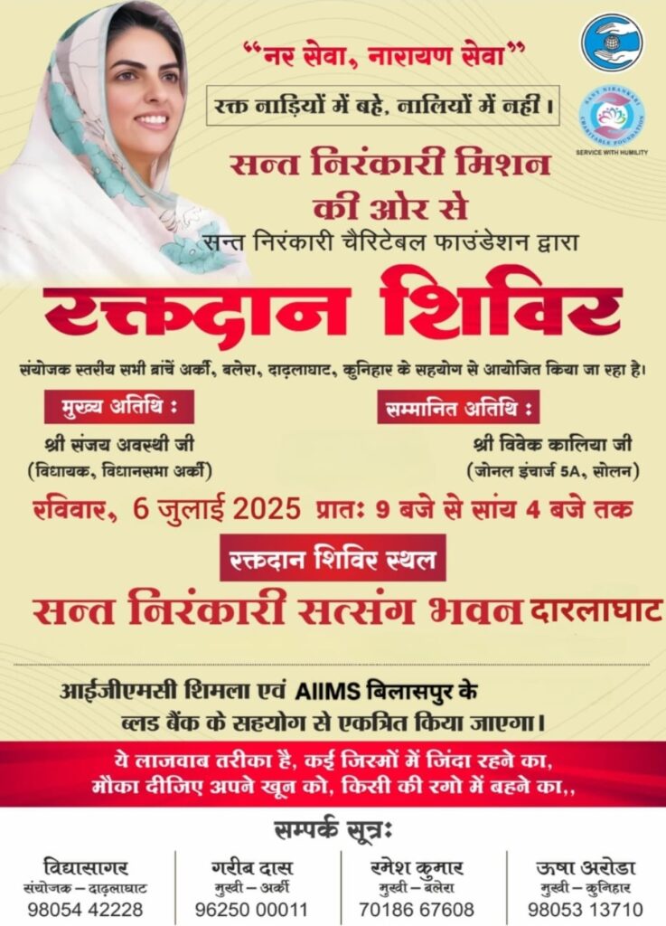 संत निरंकारी मिशन के अंतर्गत सन्त निरंकारी चेरिटेबल फाउंडेशन के द्वारा आयोजित एक रक्तदान शिविर का आयोजन संयोजक स्तर पर दाड़लाघाट में किया जा रहा है, जिसमें आप सभी सादर आमंत्रित हैं। यह शिविर रविवार, 6 जुलाई 2025 को सन्त निरंकारी सत्संग भवन दाड़लाघाट में आयोजित किया जाएगा। रक्तदान एक महान कार्य है जो जीवन बचा सकता है, और हम सभी को इस नेक काम में भाग लेना चाहिए।