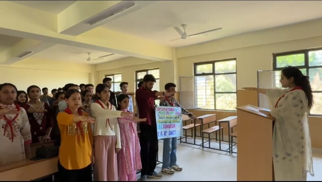 राजकीय महाविद्यालय कुमारसैन में विश्व शांति दिवस का आयोजन किया गया। महाविद्यालय की रोवर व रेंजर्स इकाई द्वारा विश्व शांति दिवस का थीम ” एक्ट नाओ फॉर ए पीसफुल वर्ल्ड” रहा। गौर रहे कि विश्व शांति दिवस प्रतिवर्ष 21 सितंबर को विश्व भर में आयोजित होता है। इस अवसर पर रोवर्स व रेंजर्स इकाई के विद्यार्थियों द्वारा विभिन्न गतिविधियों का आयोजन भी किया गया। विद्यार्थियों ने विश्व शांति दिवस के मौके पर प्रतिज्ञा तथा शांति पोस्टर भी तैयार किए। शांति प्रतिज्ञा रोवर्स व रेंजर्स इकाई की रेंजर्स लीडर प्रोफेसर लीना शर्मा द्वारा दिलवाई गई। उन्होंने कहा विश्व शांति दिवस का मुख्य मक़सद सभी लोगों, राष्ट्रों और समुदायों के बीच शांति, सदभाव और एकता को बढ़ावा देना है। अहिंसा और संघर्ष विराम के आदर्शों को मज़बूत करने तथा नस्लीय व प्रणालीगत असमानताओं से लड़ने और सभी के लिए एक अधिक न्यायपूर्ण और स्थाई दुनिया बनाने के लिए लोगों को प्रेरित करता है। विश्व शांति दिवस संघर्षों को बातचीत, तर्क और अंतर्राष्ट्रीय कानून के माध्यम से हल करने के महत्व पर ज़ोर देना मुख्य उद्देश्य है। इस मौके पर प्रोफेसर लीना शर्मा ने व्यक्तियों को दयालुता और करुणा फैलाने का आग्रह किया है। उन्होंने कॉलेज के विद्यार्थियों को संबोधित करते हुए कहा कि विश्व शांति दिवस का उद्देश्य सभी देशों व लोगों के बीच शांति के आदर्शों को मज़बूत करना है। इस मौके पर स्कूल के सभी प्राध्यापक और विद्यार्थी भी उपस्थित रहे।
