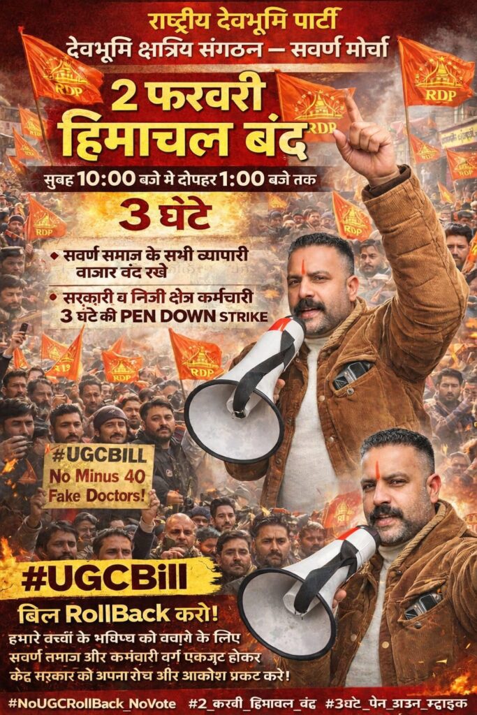राष्ट्रीय देवभूमि पार्टी ,देवभूमि क्षत्रिय संगठन एवं स्वर्ण मोर्चा द्वारा 2 फरवरी को सुबह 10:00 बजे से लेकर 1:00 बजे तक सवर्ण समाज के व्यापारी बाजार बंद करे और सरकारी कर्मचारी _निजी क्षेत्र कर्मचारी 3 घंटे पेन डाउन PEN DOWN STRIKE कर #UGCBILL का विरोध करें।